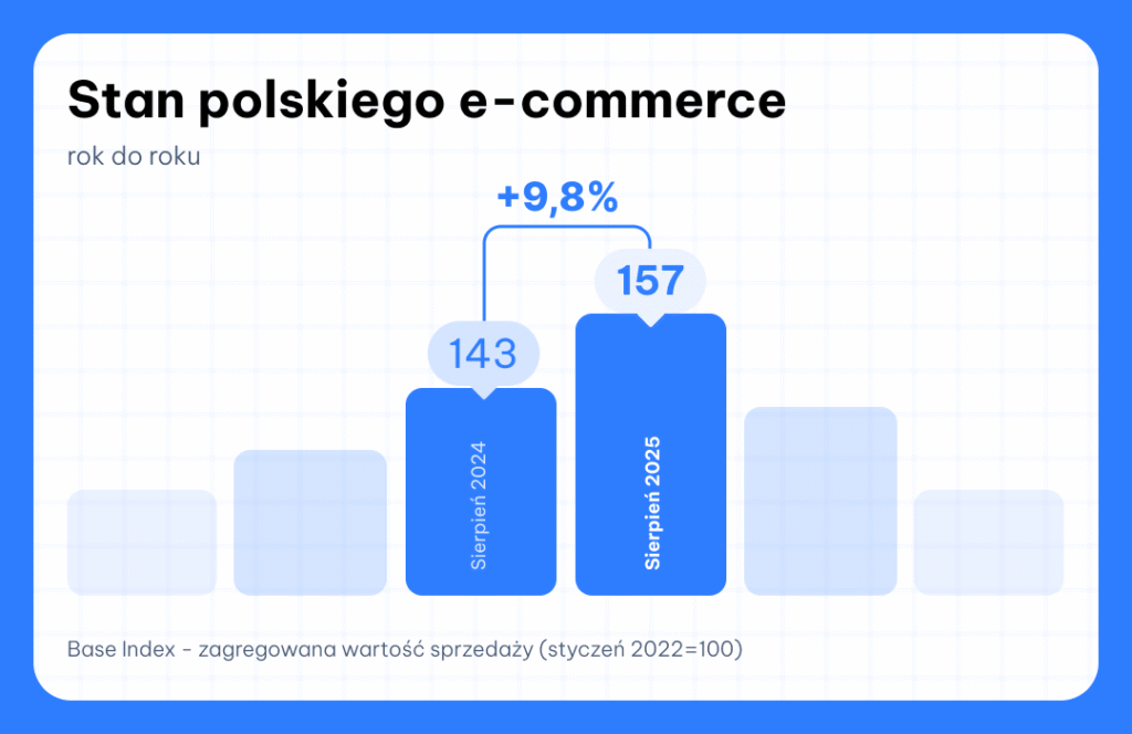 W sierpniu 2025 roku wskaźnik Base Index, który mierzy kondycję rynku e-commerce w Polsce, osiągnął poziom 157 punktów. To wynik, który — mimo że nie oznacza dynamicznego boomu — potwierdza stabilny wzrost sektora.Analiza obejmuje ponad 3 tysiące firm, co daje względnie solidną bazę danych, pozwalającą wyciągać wnioski mające realne przełożenie na to, co dziś dzieje się w e-handlu.